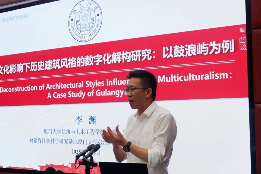 开幕式及工作汇报后,会议进入专题学术研讨环节,专题学术研讨由 厦门大学建筑与土木工程学院教授、鼓浪屿研究中心副主任李渊 主持。李渊教授首先做了题为 《多元文化影响下历史建筑风格的数字化解构研究》的报告 ,提出三维扫描与AI分析结合的建筑保护新路径。该研究开创性地融合 类型学理论+AI+GIS技术 ,实现了鼓浪屿多元文化建筑风格的数字化解构与空间模式解析, 不仅为遗产保护提供科学工具,更构建了“数据采集—智能分析—虚实传播”的全链条技术框架,推动文化遗产保护向智能化、精准化、体验化发展。