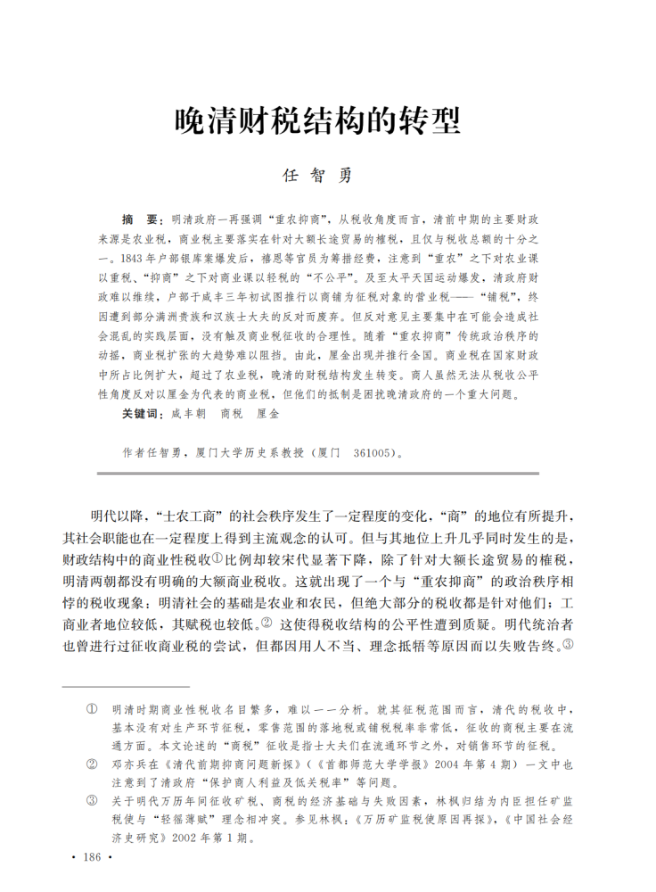 近日,《中国社会科学》杂志2022年第11期刊发厦门大学历史与文化遗产学院任智勇教授所撰《晚清财税结构的转型》一文。任教授在新作中反思了明清“重农抑商”思想下“农税重,商税轻”之悖论,详论了晚清政府在财政压力下,屡次尝试征收商业税之过程及其因引发的议论纷争,从思想、政策层面就晚清财税结构转型展开讨论。