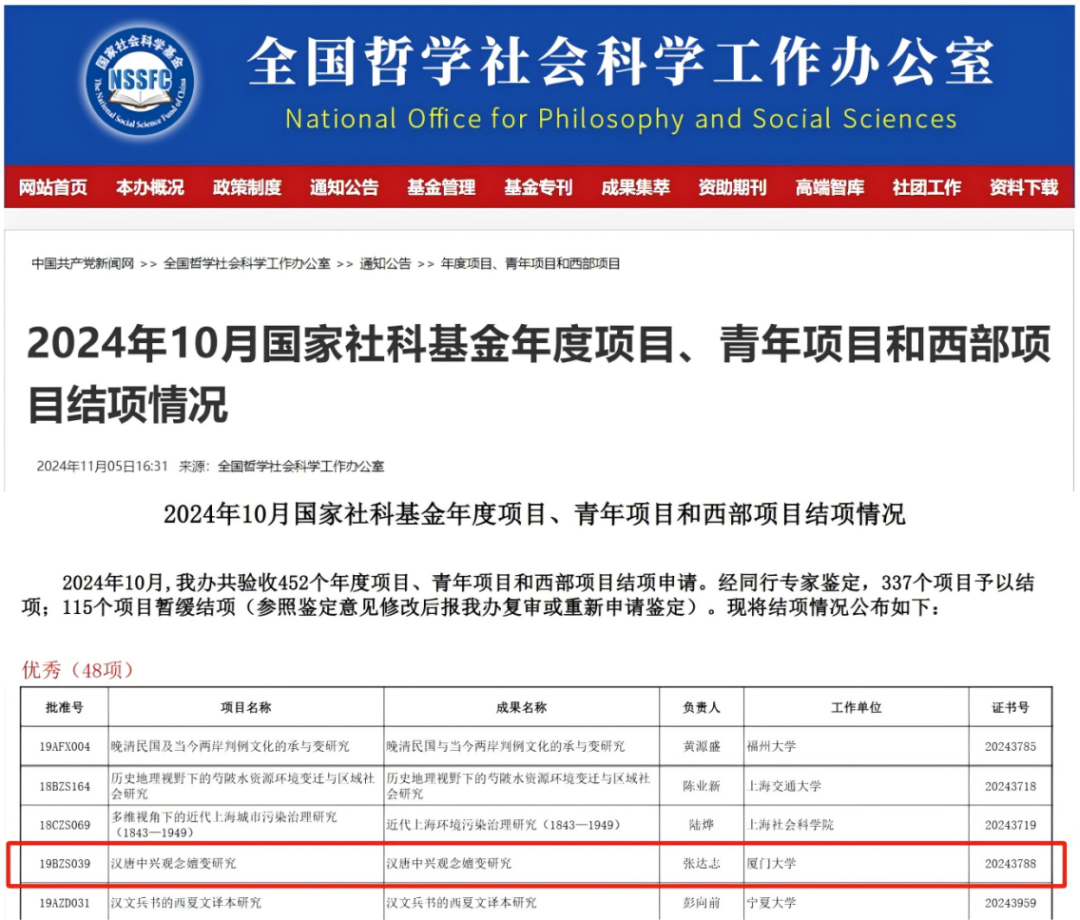 厦门大学历史与文化遗产学院张达志教授主持的国家社会科学基金一般项目《汉唐中兴观念嬗变研究》(批准号:19BZS039)于2024年10月在国家社科基金结项鉴定中获“优秀”等级。