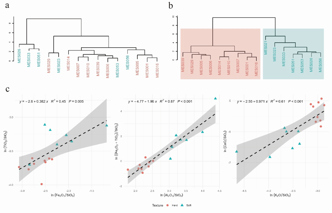 (a)陶衣层次聚类树状图;(b)陶胎层次聚类树状图;(c)胎体中ln(Fe2O3/SiO2)-ln(TiO2/SiO2)、ln((Al2O3)/SiO2)-ln(Fe2O3+TiO2/SiO2)和ln(K2O/SiO2)-ln(CaO/SiO2)散点图