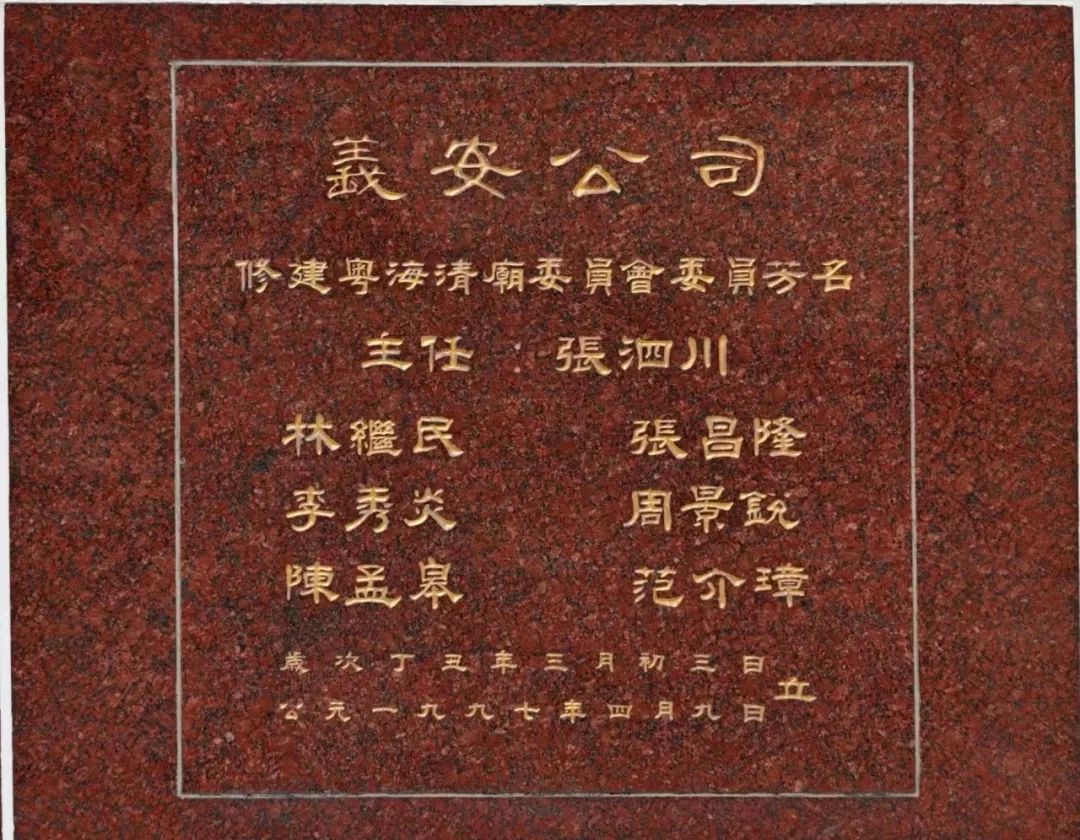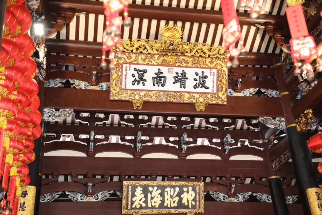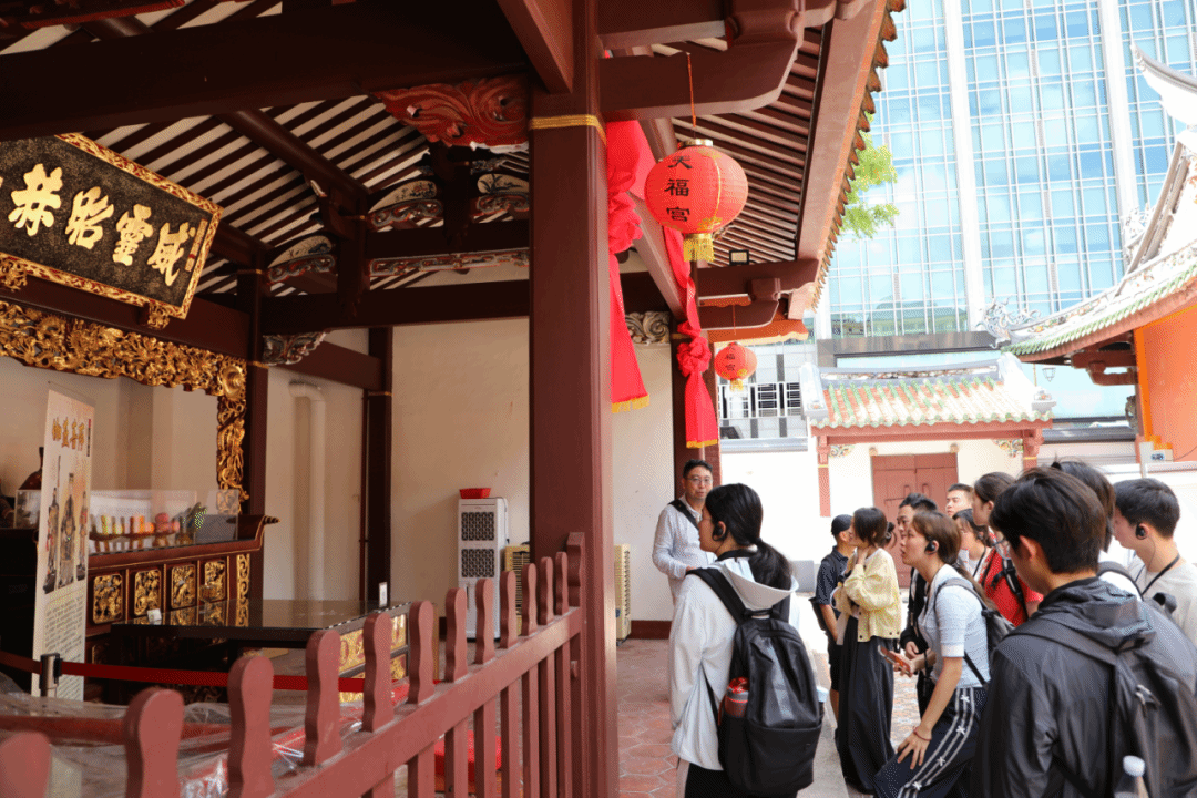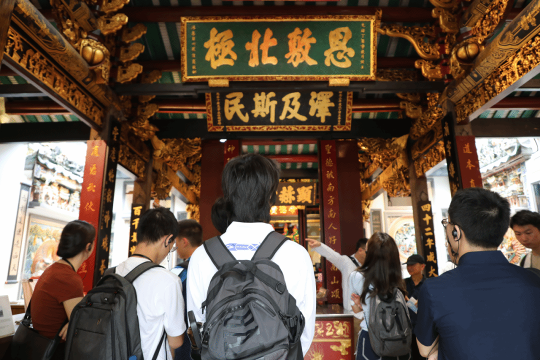 最后,实践队来到了天福宫。19世纪初滥觞的小土庙于其后不断得到闽南籍华侨的经营,从而扩展到如今的规模。蔡教授在同学们进入前便向大家布置找到光绪皇帝御赐匾额的任务,大家很快于正殿上方发现了这一“波靖南溟”之匾额。与此同时,郭教授向大家详细介绍了天福宫左右两侧的载有捐资信息的碑刻,供奉在此的有开漳圣王、伽蓝菩萨、孔子等。
