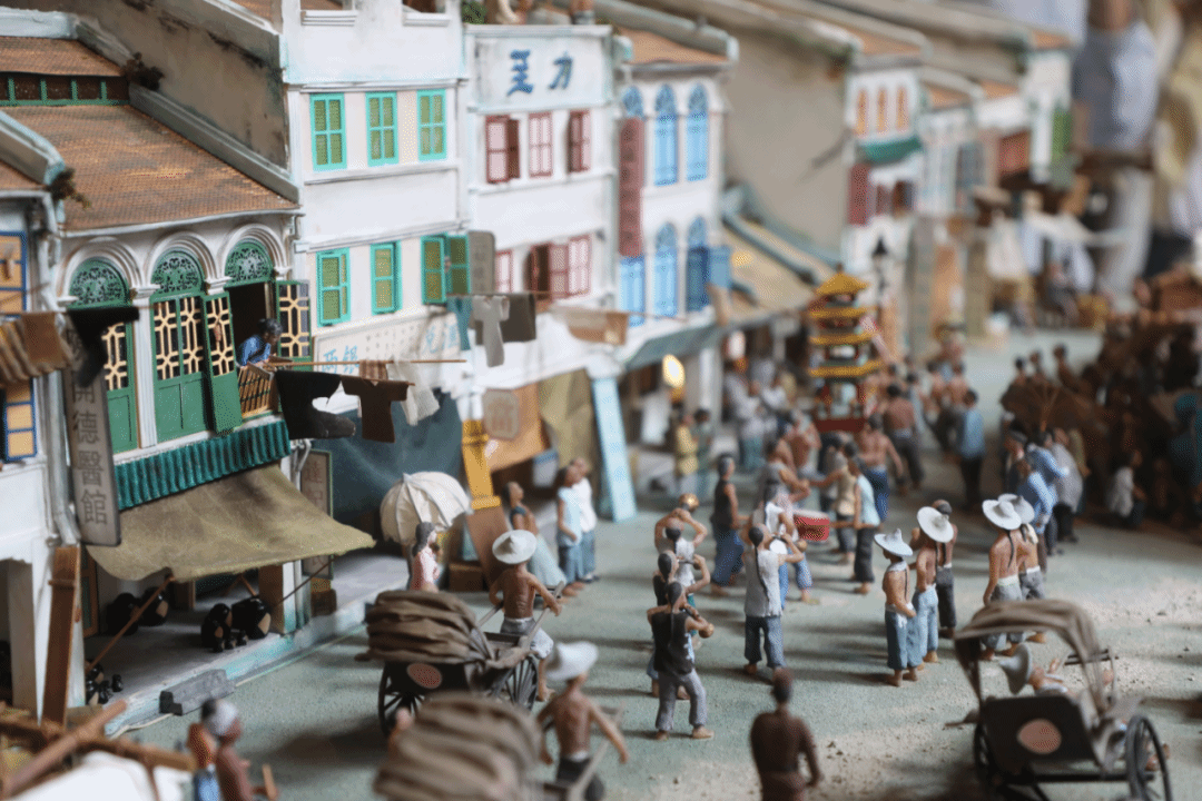 接着,同学们沿着直落亚逸街南下,到达了海唇福德祠。“海唇”即“海边地带”,”福德”指土地神大伯公。它是新加坡各移民社群所共同建立的尊奉土地神的祠堂。在两位教授的指导下,同学们仔细查看了其中所呈列的福德祠集资条目碑刻,以及还原当时海岸地区生活场景的模型。