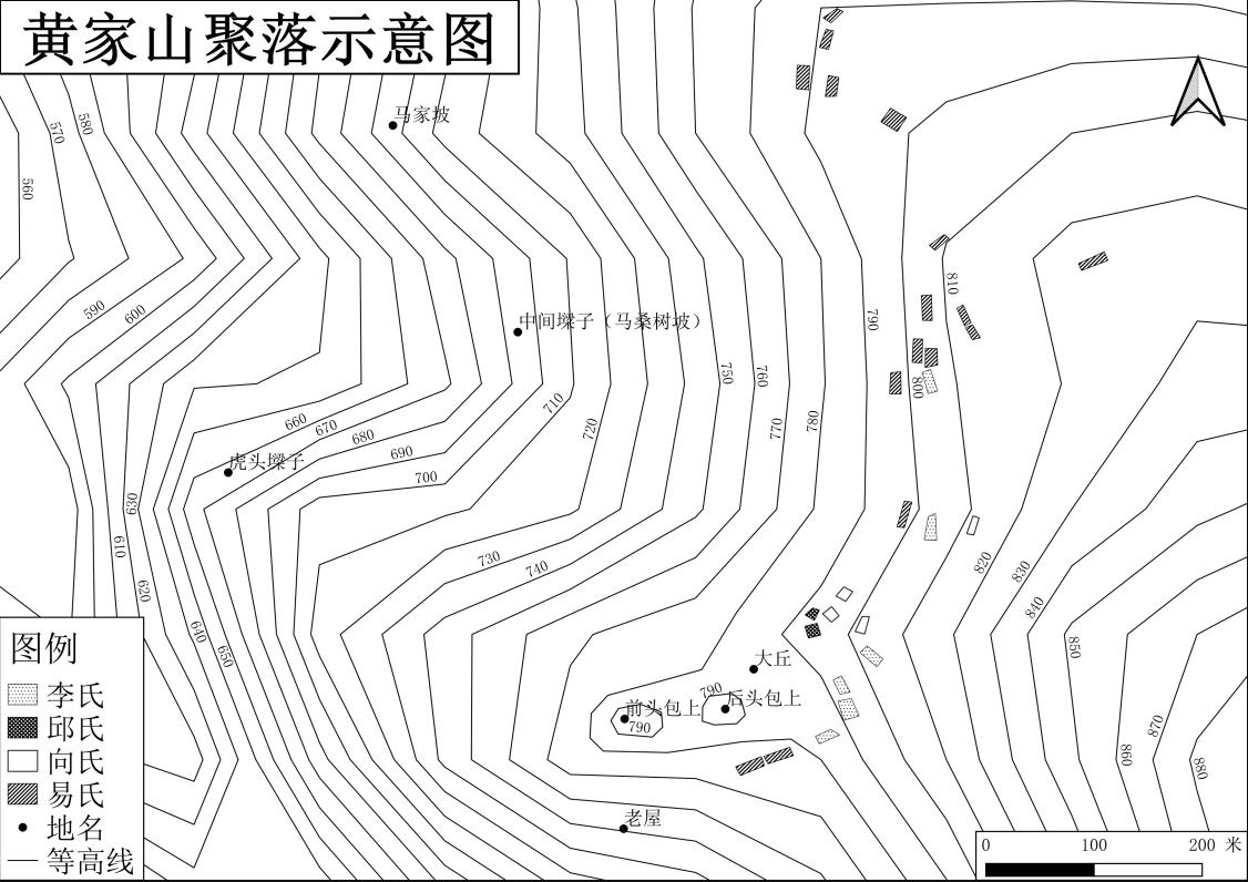 据上所述,我们大致可以勾勒出黄家山早期开发的过程。至迟在乾隆年间,李氏已经对黄家山进行了一定程度的开发,将山墚改造为耕地和平地。李氏是否一直居住于黄家山,或其在何时迁入黄家山,我们暂时无法知晓。不过,虽然李氏对黄家山开始进行开发,但在相当长的时间里,该地区可能仍然保持着人烟稀少的状态。进入晚清,易氏迁入黄家山,并迅速繁衍,从马家坡向外扩散,开辟了一些土地作为老业。民国时期,可能经过土地交易,耕地逐渐集中到少部分家族手中,李氏族人占据着黄家山最为肥沃的那片土地,杨氏在黄家山可能也占有较为重要的地位。邱氏、向氏进入黄家山,租佃李氏的土地,并逐渐定居于此。至此,我们今天所看到黄家山的人群分布,大致定型。
