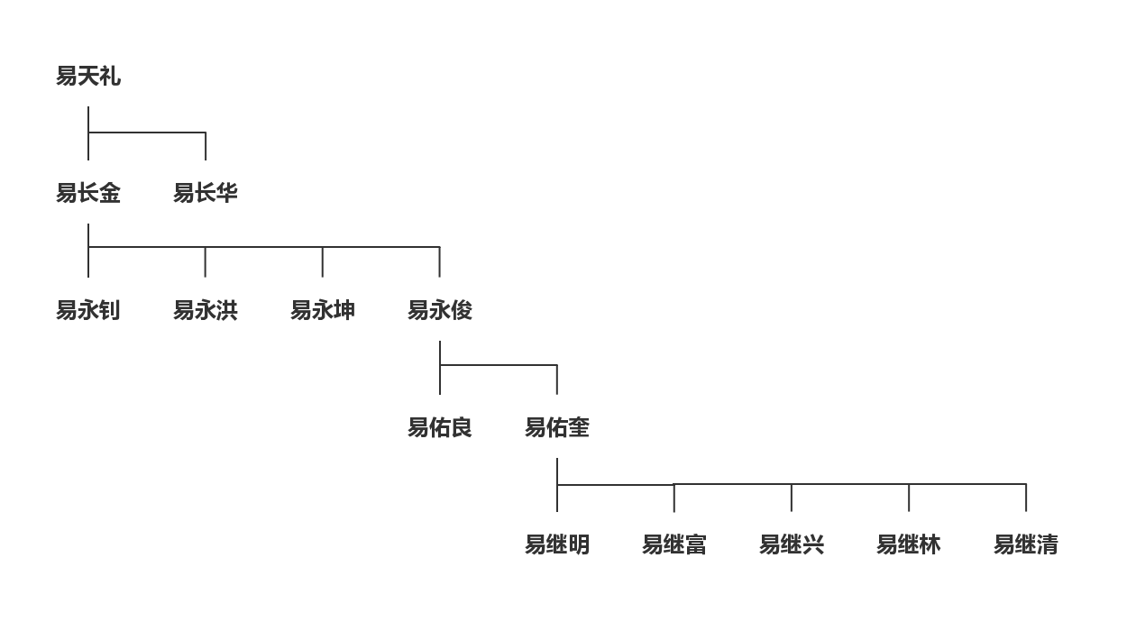 注:根据《渝东鄂西易氏族谱》绘制,以易继明讲述的直系祖先为主干,其余部分从略,根据其称易佑良为伯,将族谱中次子易佑良调整为长子。