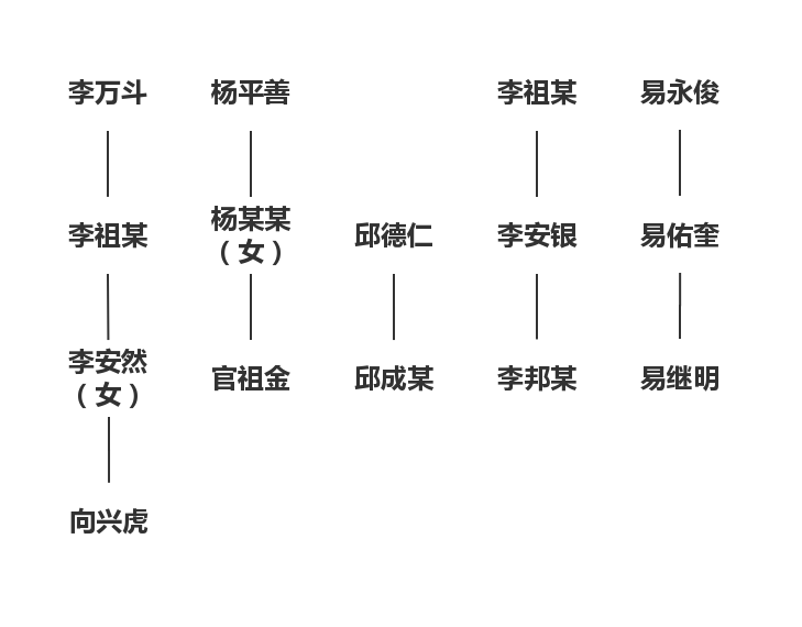 进入民国,即是黄家山易氏佑字辈、李氏安字辈正当青年的时代。易继明的回忆为我们勾勒出那个时代黄家山的人群。易继明生于解放前,尚在马家坡住过一段时间,其父易佑奎从马家坡搬到老业耕地(即现在称之为老屋的地方)建房定居,估计已是解放后的事了。除了易氏、李氏,这里还有邱氏、向氏几家人户。根据易继明的讲述,这一片水田(现均已放旱,不再种稻),除了李安银有块大丘,其余全是李万斗的课田。李万斗住在阳坡,他与黄家山李氏可能本是同宗,但在数代以前即已分房。若按照老中青三代划分,李安银与李万斗应该不是同一时代的人,他们的辈派字便是一个佐证。易继明为何将李万斗和李安银放在一起讲述,我猜测一方面是因为他与李安银有过一些接触,另一方面是李万斗较有名望,所以人们常讲述李万斗的故事而少提及其后代,这与人们的记忆选择是相符的。邱德仁原是广子湾的人,因家中人多地少,便来此处租种李万斗的课田,住在杨平善的屋中。向成富的父亲向太从同邱德仁一样,也是种李万斗的地,住杨平善的屋。杨平善有个与官祖金同岁的儿子早逝,官祖金与易氏继字辈属于同一时代。看起来,杨氏在黄家山应该也是个大户人家,但是没有信息与这种猜想匹配,也无法解释为何杨氏逐渐消失。谈到官姓,易继明说:“官氏住的地方不属于黄家山,他们是土蛮子,八大王洗四川的时候他们在山里打洞。”我们无法确定官氏究竟是不是土著居民,实际上,现在易氏和官氏并无明显界限与隔阂,邻里关系友好,且多有通婚,而附近也不见任何窑洞隧道。可以肯定的是,易继明对官氏没有任何负面情绪,“土蛮子”多半是故事中留下的固有印象,我猜测官氏可能是比易氏更早进入这一区域的家族。由于没有足够的信息,无法完全弄清楚各个姓氏的谱系,但通过比较和联系,可以简单归纳出他们相对的代际关系,如下图3所示。需要指出的是,易继明的亲家为杨家田李安林,照辈分与李安银应是同辈,但按生活年代来看,李安银与易佑奎同属一个时代。