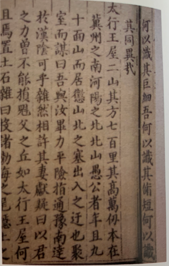 北山愚公者,年且九十,面山而居。惩山北之塞,出入之迂也,聚室而谋曰:“吾与汝毕力平险,指通豫南,达于汉阴,可乎?”杂然相许。其妻献疑曰:“以君之力,曾不能损魁父之丘。如太行、王屋何?且焉置土石?”杂曰:“投诸渤海之尾,隐土之北。”遂率子孙荷担者三夫,叩石垦壤,箕畚运于渤海之尾。邻人京城氏之孀妻有遗男,始龀,跳往助之。寒暑易节,始一反焉。