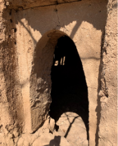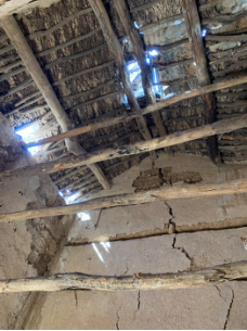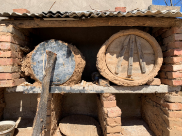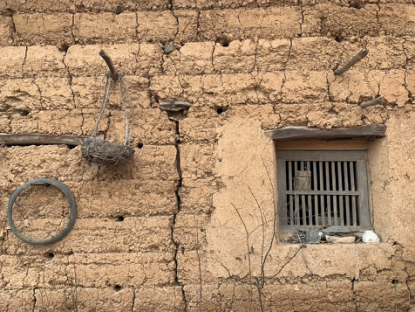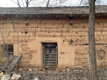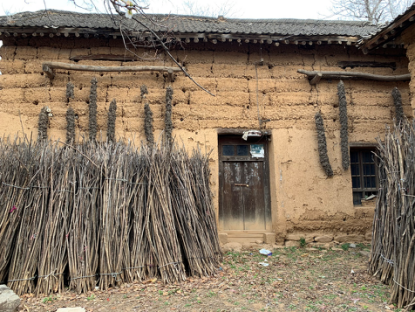 有时面前仅剩一条孤零零的窄巷,两边肩并肩站立着的是以秸秆和土块搭建的土房和以水泥砖瓦构筑的新房。新房建立着高高的围墙和装饰着繁复花纹的大门,一眼望去只觉得新得很,却看不到里面的光景。而土房则大大方方地敞开着院落,一眼即可瞧见院子那边并立着的房屋、灶火屋和杂物间。房屋上挂着一串串红艳艳的辣椒串和黄澄澄的玉米束,有些房屋外侧墙上还会挂着羊皮。土墙上谨慎地开了一个小小的窗户,黝黑狭窄,透光性很差。房门则是由圆圆的木头框起来的一个长方形。灶火屋也很好辨认,矮小漆黑,紧靠在房屋的边角,墙上是烧火时熏出来的黑。