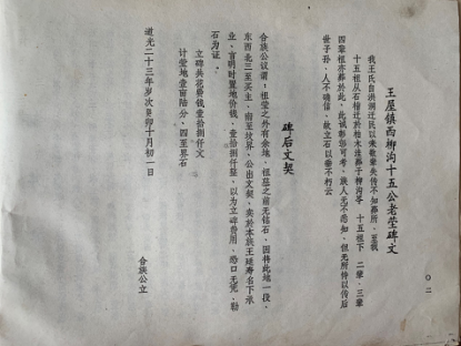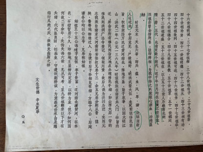 家谱最开头有一篇“己巳年庚午月吉日”作的《谱序章》,后附道光二十三年(1843年)立的一块碑上的「王屋镇西柳沟十五公老茔碑文」及「碑后文契」。之后还有一篇1963年的续章、一篇“辛末(1991年)夏事”续修时的序文。至于最开头的己巳年指的是哪一年,我本来并不确定,但之后就在最后一篇“辛未序谱章”里找到了答案:“我十五公历经明、清、民国至今六百余年。最早幸存之家乘乃聚民及开章祖于公元一八六九年所续。”看来最早修谱是在道光二十三年立碑之后的事情了。起初我猜想最早的序文时间应该早于之后所有时间点,于是猜测是距道光二十三年最近的1809年及以前的序文,现在看来随便猜测的后果便是南辕北辙了。己巳年这篇序文提到“如我始祖,固居洪洞,望祖也,于洪武初年迁诣济源石槽,宅居二百余年”,这是十分出名的“山西洪洞大槐树”移民传说,我爹以前也说我们祖上是山西的。但是在“辛未夏事”一篇内却与前述说法截然相反:“洪武二年(1369年)时值我族在南京共八门,奉旨内迁。并告示所有移民到指定地点办理移民手续。如山西太原一带的移民到洪洞广洛寺登记,领取川资,故后人误为洪洞为源。实则元末我族自南京迁河南新安伯仲叔兄弟十三,余五兄弟分别从晋、豫、陕、鲁等地相继迁入。”这令我们这一支王姓族人的祖先溯源问题又扑朔迷离起来。不过我寻思这些祖先传说故事的可靠性实在不高,研究出现这种群体记忆的社会文化心理原因应该要更重要一些。在第一次阅读这些序文时,我只顾着看挂印拜相的传奇故事了,竟也没有好好阅读里面各种更加妙趣横生的历史记载。里面还有记载道光时期王姓族人祖坟所在地,并在碑文后附上了一个祖坟外余土地的买卖契约。还有1963年序文所载的将总谱一式四本分门保存、每支各存小谱一份的约定,以及从光绪年间拖延到民国十七年的家庙大殿修葺工程等等……实在是非常丰富了。如果有机会,我大概会更加细致地研究一番吧。
