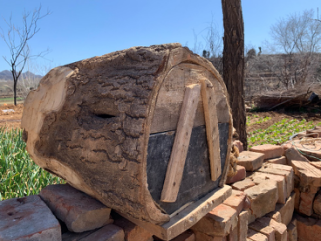 90年代以后村里基本不种烟草了,烟炕也逐渐废弃掉了。这些残存的烟炕估计也逃不过被铲除的命运。但是在它没有最终消逝之前,终于还是留在了我的记忆里。跟着小姑一路走一路聊,一眼又看到了别人家门外放着的一个奇怪的木桶。看起来像是树桩做桶,木板做盖,再以木条封上——纯手工制作,取材于自然,显示出农村不肯完全被商品经济占据的倔强。这个木桶外表像酒桶似的,但其实是一个蜂箱——村民拓展的生计副业广泛若此也!