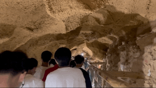 从博物馆中走出,我们带着对古动物化石的初步认识,继续前往桦林古生物化石埋藏原址馆,走近真实的发掘现场。和政县松鸣镇桦林村是和政地区最重要、最完整的化石原址之一,化石出露面积约1万平方米,是唯一一个集中出露、非采洞内的化石产地。这里的化石依然静静埋藏在原始的地层中,以最直接的方式展现着和政地区化石出土的环境与发掘过程。我们还在讲解员的带领下进入了“采洞体验区”,在仿制的考古现场学习古生物演变。
