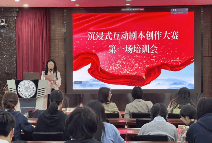 接着,张晗作互动剧本创作技巧培训。她从剧本创作的全流程出发,为同学们系统梳理了从搭建框架、人物与案件设计到美工道具的创作闭环。她强调,红色互动剧本不同于普通互动剧本,其核心在于历史真实性与价值引领的深度融合。针对备赛中常见的“雷区”,张老师也一一划出重点:第一,剧本创作过程要避免对历史人物的片面评价和脸谱化人物塑造,做到客观公正;第二,价值观的传递要用剧情推动,而非生硬灌输,靠剧情自然推动红色思想“润物无声”,才是好剧本的标准;第三,运用好音视频、实物道具等多种呈现形式,让红色故事既有历史的厚度,也有互动的温度。