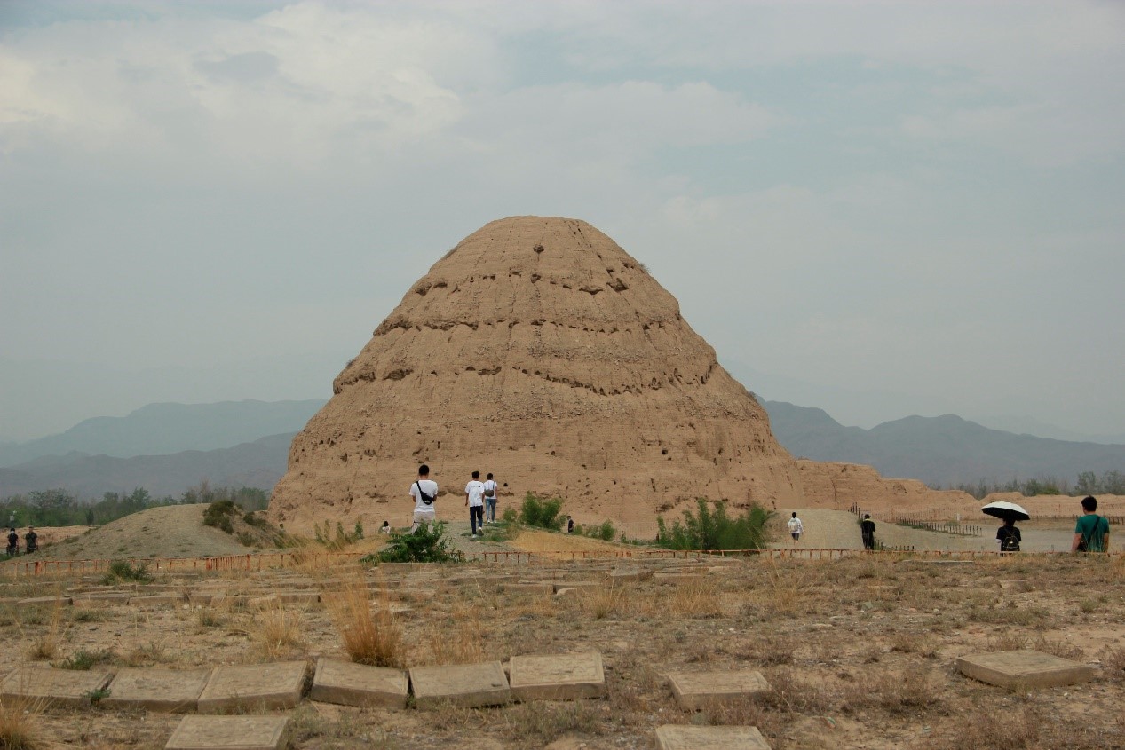 参观博物馆之后,师生一行实地探访西夏王陵。西夏王陵的建筑风格别具一格,是汉族文化、佛教文化、党项族文化的有机结合,有“东方金字塔”之美称。据了解,西夏王陵计有裕、嘉、泰、安、献、显、寿、庄、康九陵,周围布列陪葬墓。考察团参观了被推测为是西夏开国皇帝李元昊陵墓的三号陵。三号陵坐北朝南,位于陵区中部偏南处。该陵呈左右对称的格局,原本有着城墙、碑亭等结构,形成类似于现实宫殿的形态。