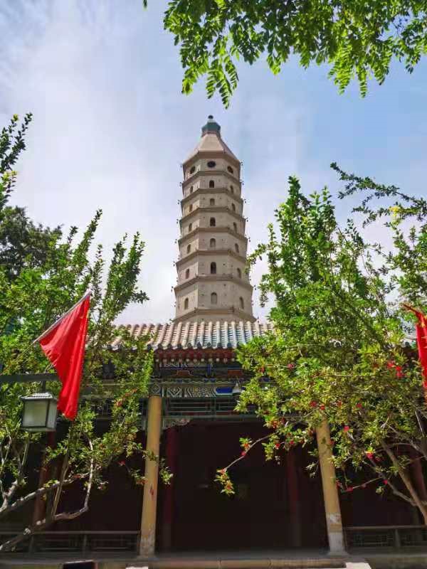 28日下午,师生一行前往承天寺和黄河外滩参观。承天寺建于西夏天祐垂圣元年(公元1050年),是西夏著名的皇家寺院。寺内的承天寺塔“是宁夏古塔中唯一一座有文献记载修建年代的古塔” 。寺塔为11层楼阁式砖塔,八角形,通高64.5米,呈东西向布局。塔上檐角镶有石榴状的铁柄,挂有铁铃。清乾隆三年(公元1739年)宁夏大地震,塔、寺全部震毁。嘉庆二十五年(公元1820年)在残塔基础上重新建造。今存的承天寺塔虽非原建筑,但仍保持了西夏原塔的基本形制和造型风格。寺内建筑庄重古朴,浸染着历史的气息。