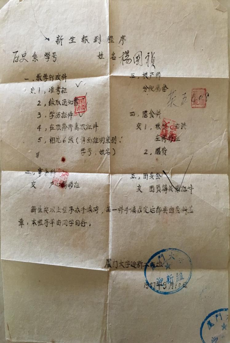 当天新生报到的程序是这样的:厦门大学迎新组发给每个同学一张程序单,由新生依序到各科摊位办理报到手续,先到教学行政科交准考证、录取通知书、学历证件、在职干部离职证件、相片6张;二到事务科交户口转移证;三到校产科分配宿舍;四到膳食科交粮食、油供应转移证和膳费;五到团委会交团员转关系证件。每科手续办完后都要由各科盖章,程序单由同学自存。