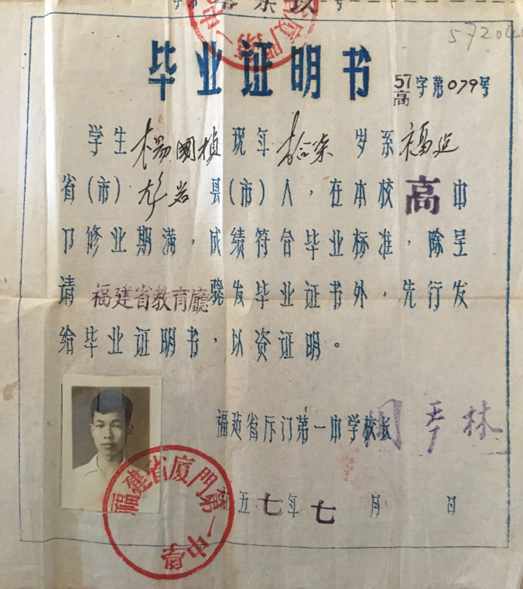 1957年7月,17岁的我从厦门第一中学高中毕业,参加高考,厦门一中开具的毕业证明书上有我的照片,一副少年不知愁滋味的模样。