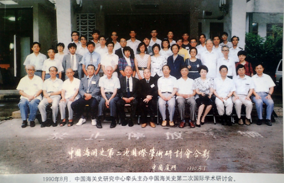 ●:国际交流是很重要的。但说起中国海关史中心参与或主办的国际会议,也算是机缘巧合。我从前是研究明史的,1958 年出版的官手工业这本书,虽然只有 11 万字。但这本书发行到香港去,香港大学校长、中文系的主任,看到这两本书,觉得很好,结论不错。天津南开大学郑天挺先生举办第一次全国明清史国际会议,邀请我去参加。香港大学校长王赓武教授,他也去参加。在会上,他与我交谈,提起看过我的这本书。后来,我就写信给他,我说我现在搞了个中国海关史研究中心,想举办一个国际会议。我们在世界上没有气、没有地位,香港大学世界上有名气、有地位,我说是不是请你们带头来举行这个海关史第一次国际会议。他回信给我说可以,他已经同研究历史的两位老师(谈过),请他们负责筹备。我就各个学校去查,看世界上有哪几个人研究海关史,就请他来。王教授也认识一些人,这样一来,我们同他合起来,举行了第一次的国际会议。这次会议,由中山大学、《历史研究》、《近代史研究》、我们厦门大学海关史研究中心,以及香港大学,五个单位联合合办,由我们研究中心牵头。来参会的有二十多人,并来了两个美国学者。在这个会后,中山大学等四五个单位同我们联系,要举办第二次会议。第二次会议在我们学校召开,由我们研究中心做主人。这次来的人就比较多了,大概有三、 四十个。第二次以后,我就计划在美国、日本、台湾继续开下去。我同美国来参加会议的学者商量,第三次在哪里开好?他建议还是在香港,在中文大学开。于是,在香港中文大学王赓武教授以及当时在中文大学任教的许倬云教授、我们学校的副校长郑学檬教授的帮助下,我们申请到台湾的蒋经国学术基金的资助,1995年,便在香港中文大学召开了第三次的国际会议。来参加会议的,大概有日本、加拿大、我们大陆,还有香港以及香港附近的大学,有四五个国家和地区的学者参加。这是我们海关史研究最盛的时候,一下子就召开了三次国际会议。三次 国际会议都出了一个动态,中国海关史的研究就传到外国去了,扩大了国际交流与影响。另外,通过三次国际学术会议的召开,海关史的基本问题,慢慢都清晰起来,经过反复讨论,大家深受启发,获益良多,这是关起门来做学问所不能获得的东西。