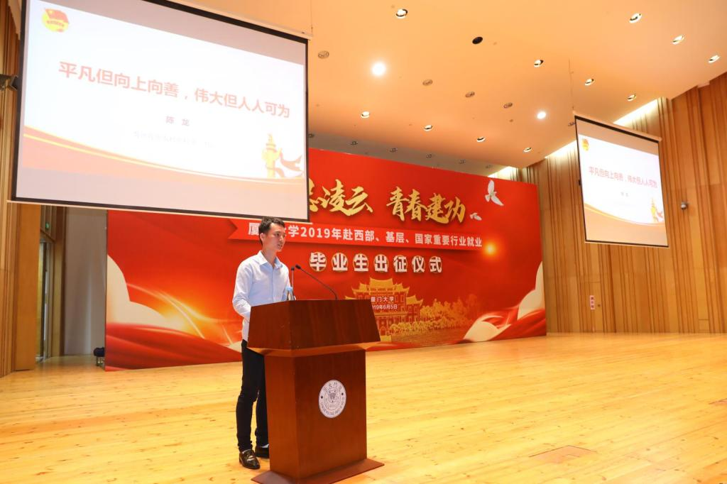 仪式邀请2014届人文学院历史系硕士毕业生、贵州省黑水村第一驻村党支部书记陈龙作为校友代表发言。陈龙分享了自己作为“骑行书记”“驻村奶爸”奋斗在祖国脱贫攻坚的心路历程。勉励学弟学妹们要常怀家国、不断追逐青春梦想,勇于投身西部基层和国家重要行业,切实担负起实现中华民族伟大复兴的中国梦的历史使命。